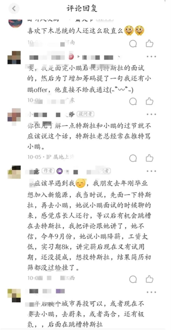 自称为特斯拉前销售的网友声称,确实存在不要小鹏前员工的情况,其他品牌蔚来,极氪员工则可以被接受。