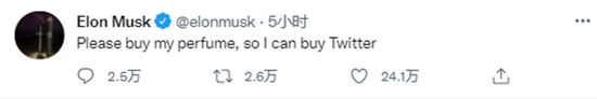 他还调侃到,这是“地球上最好的香水”、 “请大家快来买,这样我就可以收购推特了”。