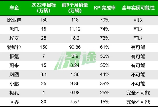 比亚迪、哪吒、埃安这三家公司,今年前9个月的业绩完成率是最高的,都超过了70%,其中又以比亚迪最高。按照它们当前的速度,完成2022年的全年销售目标应该是没问题。