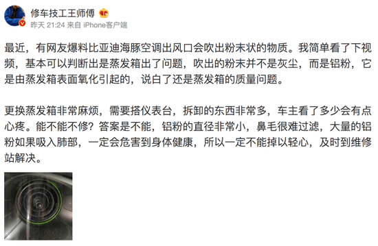 而关于车辆吹出的粉末到底是什么,有专业人士指出该粉末为铝粉。其表示:基本可以判断是蒸发箱出了问题,吹出的粉末并不是灰尘,而是铝粉,是由蒸发箱表面氧化引起的。