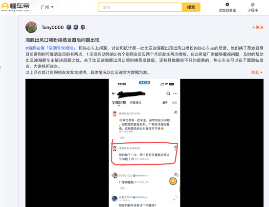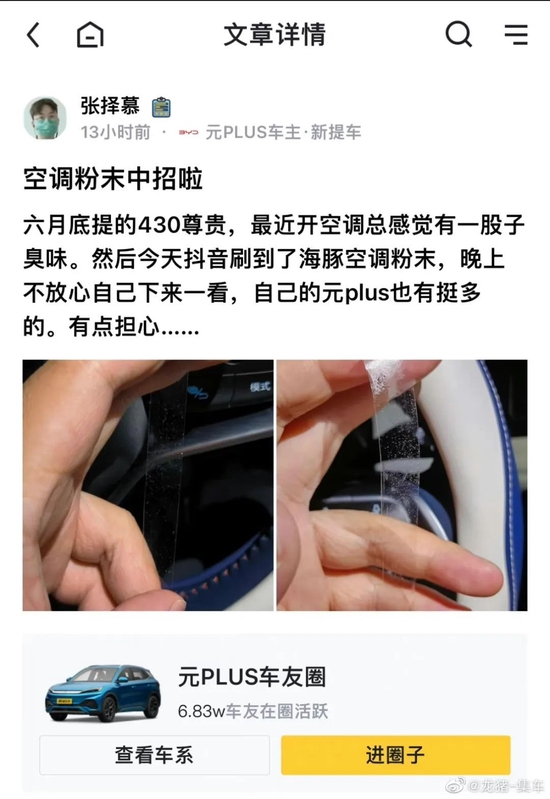 多位海豚车主称出风口喷出粉末!比亚迪紧急回应