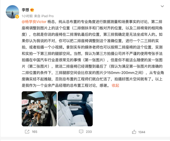 “如果你认为我说的不对,你可以把二排座椅调整到这个准确位置,进行一个二三排的实拍,或者拍摄一个小视频。”李想在文中指出,这是第三方拍摄公司并不严谨的使用夸张手法拍摄所致,这在中国汽车行业也很常见。