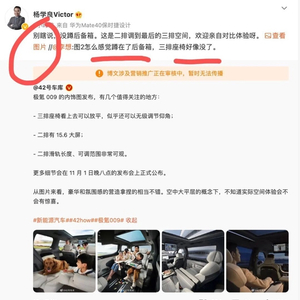 当天,极氪009公布了内饰图和配置信息。理想汽车CEO李想转发评论称,官图中的第三排乘客怎么感觉蹲在了后备箱,三排座椅好像没了。