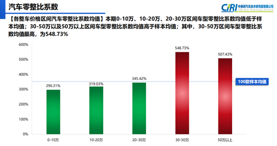 值得注意的是,尽管零整比系数高的车型多出自豪华品牌,但并非车价越高零整比系数越高。如果按照价格区间的维度来看,30-50万元区间车型零整比系数均值最高,为548.73%;其次才是50万元以上车型,零整比系数为507.43%。