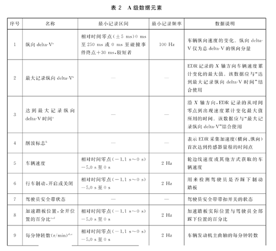 另外,在 GB 39732—2020《  汽车事件数据记录系统  》 里,还规定了 EDR 记录信息必须包括速度、加速度、车辆制动状态、加速踏板百分比等 17 项数据。