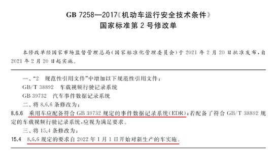 根据 GB 7258—2017《 机动车运行安全技术条件 》第 2 号修改单的规定,从今年 1 月 1 日起,所有新车强制配备 EDR。