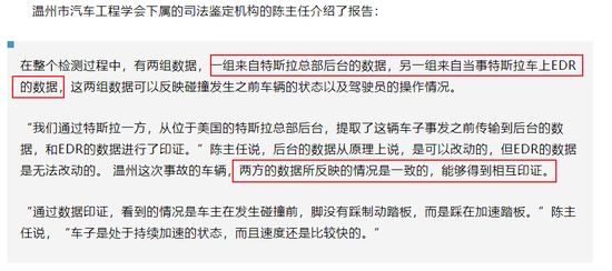 前年在温州发生的特斯拉事故,司法部门通过对比车上EDR数据和特斯拉总部后台的数据,在两者一致后才确定结论。