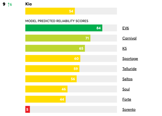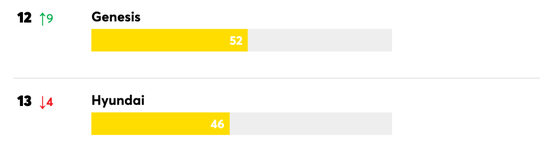 韩系品牌中,起亚的排名比现代更高,起亚排名第9位,较2021年提升了6位,是前十榜单中唯一的韩系品牌,而现代排名第13位,较2021年下降了4位,不及其豪华品牌捷尼赛思。近几年来,现代的可靠性排名下降明显,可能与其中美国频繁召回相关。