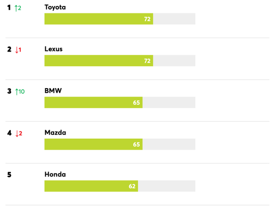 在《消费者报告》最新统计的年度可靠性报告排名中,丰田、雷克萨斯、宝马成为可靠性最佳的三大品牌,前十排名中日系品牌继续在榜单中占据主导地位,丰田、雷克萨斯、马自达、本田、斯巴鲁、讴歌占据六席。具体来看,2021年排名第三的丰田取代雷克萨斯成为榜首,雷克萨斯跌至第二,而2021年排名第二的马自达被挤出前三,被宝马取代。