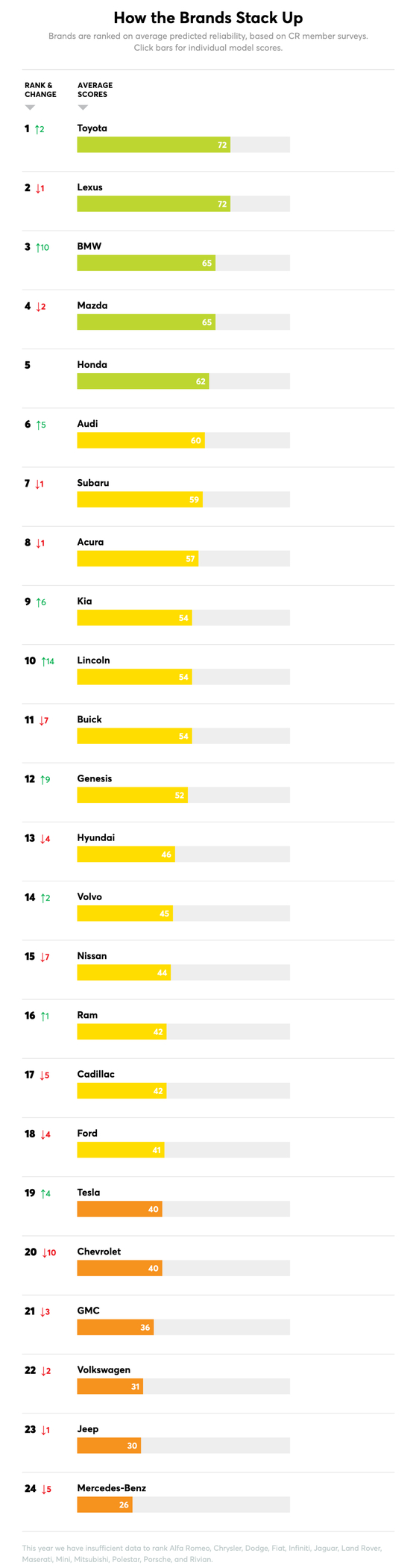 据了解,《消费者报告》对新车可靠性的分析和评分基于对汽车质量的整体衡量,包括道路测试性能、车主满意度调查结果、车辆是否配备关键主动安全系统,以及碰撞测试结果,旨在让消费者能更容易迅速地找到满足他们需求的最好的轿车、SUV和卡车。2022年汽车品牌可靠性报告涵盖24个历史悠久的汽车品牌,由于车型太少或数据不足,阿尔法·罗密欧、克莱斯勒、道奇、菲亚特、英菲尼迪、捷豹、路虎、玛莎拉蒂、MINI、三菱、极星、保时捷和Rivian无法参与2022年汽车品牌可靠性排名。