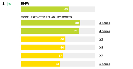榜单中还有一点值得关注,作为长期以来竞争最激烈的三大德国豪华汽车品牌,宝马的排名上升了10位,挤进长期被日系品牌霸占的前三名,奥迪较2021年相比也上升了5位,而梅赛德斯-奔驰却意外垫底,这也是该品牌史上在该榜单中垫底。特别注意的是,保时捷一直是在《消费者报告》中排名较高的豪华品牌,2021年排名第13,但本年度却因为数据不足或产品不够未出现在榜单中。