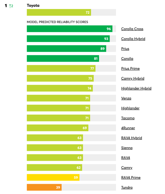 丰田成为最可靠的汽车品牌得益于旗下多款评分较高的车型,卡罗拉双擎(Corolla Hybrid)在报告中被评为最可靠的车型,而卡罗拉锐放(Corolla Cross)、普锐斯(Prius)和卡罗拉(Corolla)的可靠性也被评为“远高于平均水平”。