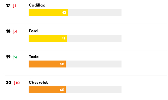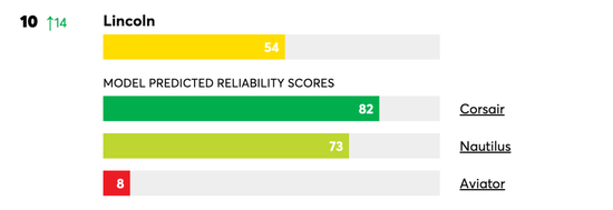 虽然Consumer Reports为美国权威机构,但似乎对本土品牌并不“友好”。在前十榜单中,2021年垫底的林肯品牌绝地反击,成为前十榜单中增长最快的品牌,也是前十榜单中唯一的美国品牌,其中冒险家以82分的成绩跻身成为最可靠的汽车之一,另外航海家的成绩为73分,但飞行家被评为最不可靠的汽车,评分只有8分。其它美系品牌方面,90%以上的美系品牌出现下滑,其中Jeep、GMC、雪佛兰排名均在20名以外,特别是雪佛兰,排名较2021年相比下降了10位,排名的下滑可能受到新车型大规模革新的影响,旗下Bolt EV、Bolt EUV因电池问题和电力驱动故障而被特别点名。此外,2021年倒数第二的特斯拉排名上升了4位,虽然在24个品牌中排在第19位,但可靠性仍低于平均水平。