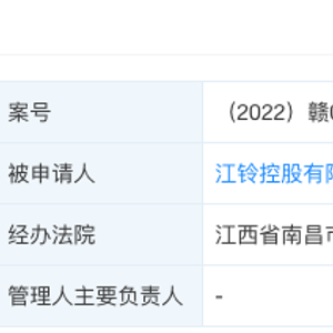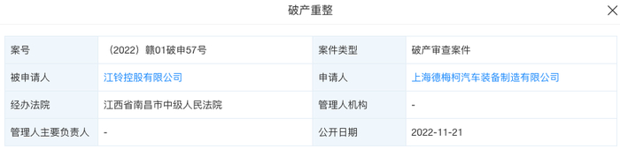 一则‘破产审查申请’讯息再次将沉寂已久的江铃控股拉回到大众视野。天眼查App信息显示,11月21日,江铃控股有限公司(下称“江铃控股”)新增破产审查案件,申请人为上海德梅柯汽车装备制造有限公司,经办法院为江西省南昌市中级人民法院。“破产审查案件”是指审查申请破产的企业是否具有破产资格,换言之,一旦企业符合破产资格意味可以申请破产重整。截至目前,关于江铃控股有限公司(下称“江铃控股”)新增破产审查案件事件,江铃控股官方暂未作出回应。