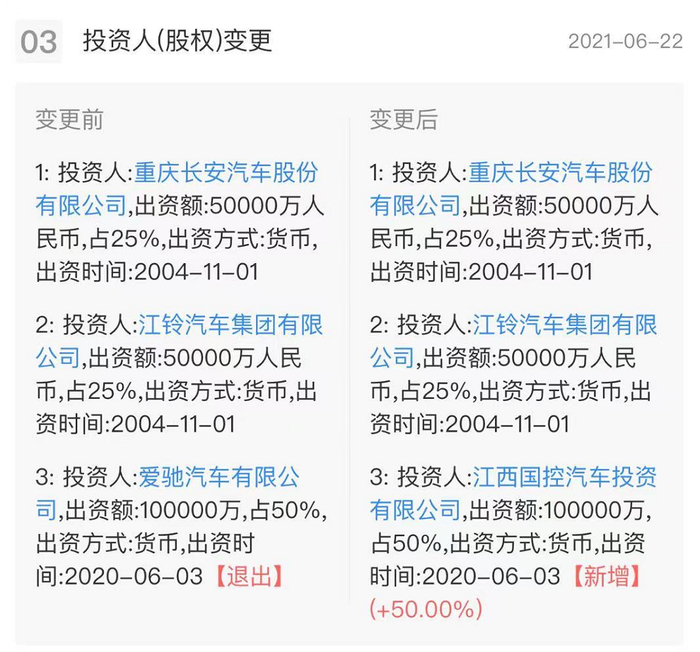 在此背景下,江铃控股也试图通过增资扩股及转型方式进行“自救”,但一系列举措后依然无法将江铃控股拉出泥潭。2019年7月,江铃控股引入造车新势力爱驰汽车作为战略投资者进行增资,爱驰汽车大手笔投资17.47亿元拿下江铃控股50%的股份,成为最大股东,江铃汽车和长安汽车的股份则分别由50%稀释至25%。至此,江铃控股获得新生,开启由造车新势力主导的央企、地方国企和民营企业三方混改试点项目,同时向新能源、智能化方向转型。