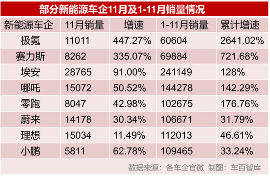 另据新能源车企1-11月的累计销售数据,传统车企的新能源汽车公司,哪吒、零跑等新势力二代的销量增速都达到了100%以上,而蔚小理的增速均没有超过50%。