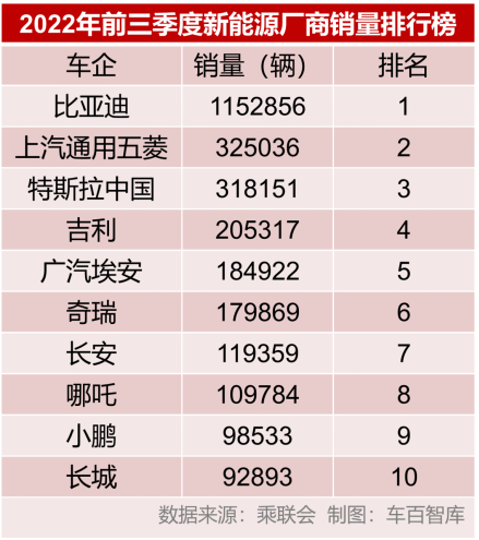 从前三季度的销量来看,据乘联会数据,前三强中,比亚迪、上汽通用五菱为传统车企,而排名第三的是特斯拉中国。蔚小理等新势力中,仅小鹏汽车进入销量前十名。