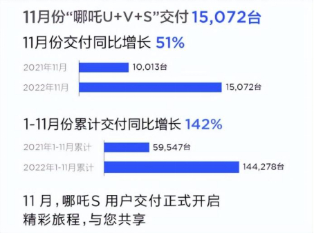 哪吒11月销量为15072辆,且连续7个月交付过万。1-11月,哪吒汽车的累计销量达到了144278辆,距离年销15万辆的里程碑,仅差5722辆。