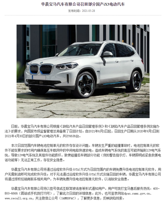 2021年5月28日,华晨宝马宣布召回6636辆iX3汽车,召回原因为电池控制单元软件的设计缺陷,导致车辆发生碰撞后警告指示灯、车辆照明或紧急救援电话等功能等无法正常工作。