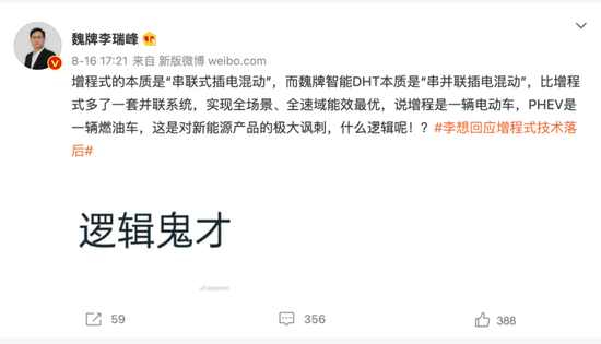 2022年,关于“增程技术”是不是落后的话题,曾引发了汽车圈的一场口水仗。理想汽车CEO李想,魏牌汽车CEO李瑞峰,原大众中国CEO冯思瀚在社交媒体上你来我往,岚图汽车CEO卢放,威马汽车创始人、董事长兼CEO沈晖也曾下场帮腔。