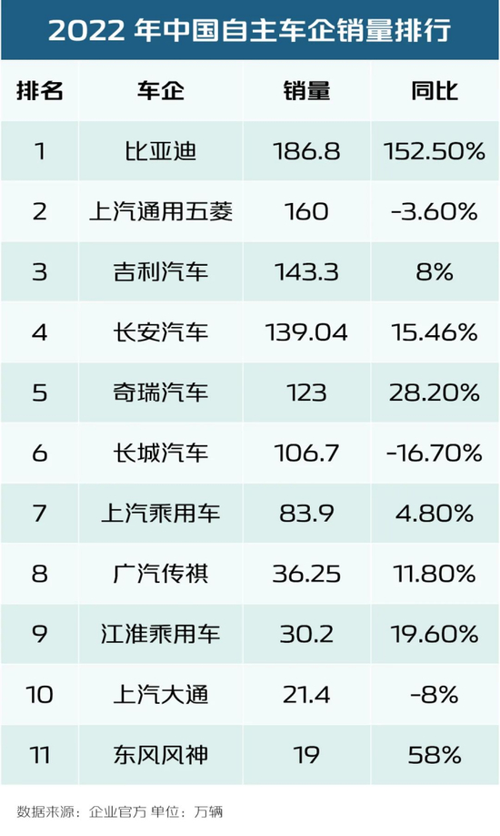 2022年,比亚迪几乎成为车市现象级的存在,全年累计销量达到186.9万辆,同比增长152.5%。吉利在智能电动车转型的关键之年依旧卖出了143.3万辆,同比上涨约8%,连续6年产销突破百万辆;长安自主乘用车累计销量139.04万辆,同比增加15.46%。