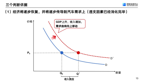 第一个依据,经济逐步恢复并将逐步传导到汽车需求上。因为透支因素在前三个月消化完,现在已经不存在了。GDP增长就意味着这个蓝色需求的曲线会向上移动。GDP增长越快,需求曲线向上移动的就越快。需求曲线一旦向上移动,即使价格不动,销量也从Q0到Q’这个地方,这就是收入带来一种增长的效应,后面比较谨慎乐观的判断最主要的依据就是经济不断的恢复。