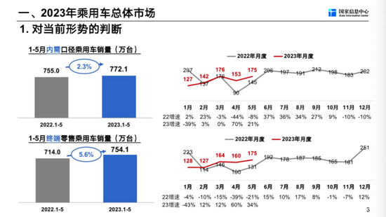 这是两张图,上面这张图可以看到内需口径乘用车销量1-5月增长2.3%,下边的图是终端数据,也就是消费者直接买车的数据,增长了5.6%。这两个数据看起来应该还是不错的。我们稍微把它放长一点,跟2021年比较一下,2021年1-5月份内需口径乘用车销量是814.9万辆,今年是772.1万辆,这两个批发数据相比还是下降了5.3%。