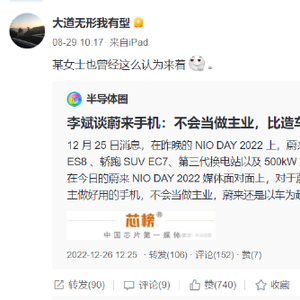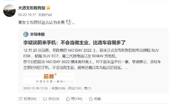 不过,当天早些时候,著名投资人段永平就转发了某媒体在去年底发布的“李斌谈蔚来手机:不会当做主业,比造车容易多了 ”一文,并评论称,某女士也曾经这么认为来着。