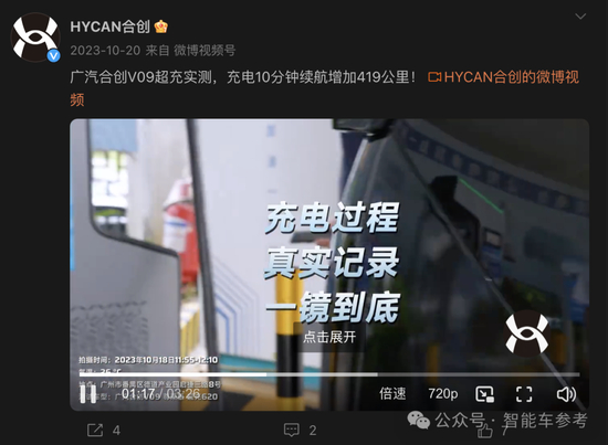 后续合创通过微博账号发布了一镜到底的充电视频,其中显示,充电10分钟后,合创V09续航增加了419km,相当于变相回应了对充电能力的质疑。