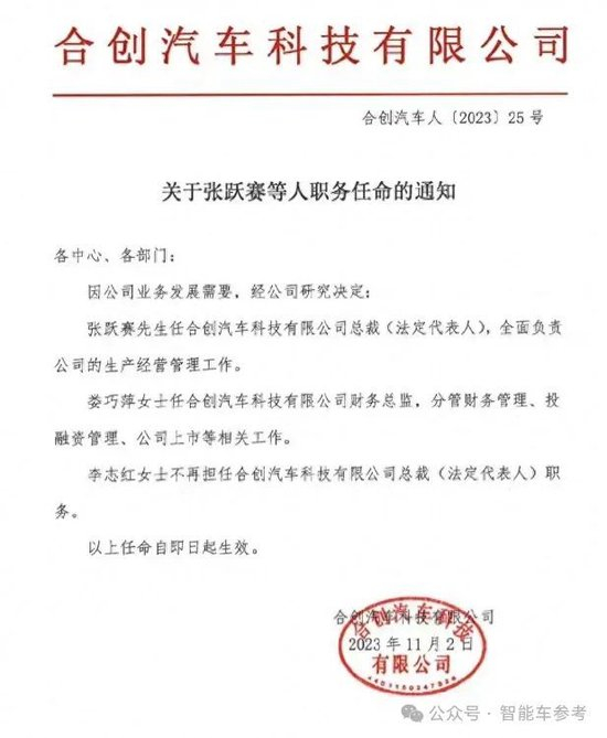 去年11月2日,合创汽车发布公告宣布,张跃赛成为公司新任总裁(法定代表人),全面负责公司的生产经营管理工作,娄巧萍担任财务总监。李志红不再担任公司总裁(法定代表人),任命即日起生效。