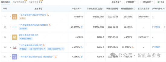 根据企查查的信息显示,珠江投管的全资子公司珠投智能依旧是合创第一大股东,持股比例达到68.5594%,其次是广汽埃安、耀煜投资和广汽集团。