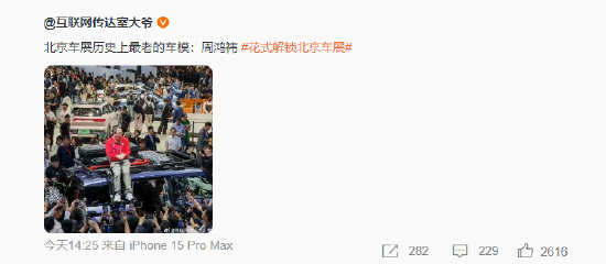 2024北京车展今天举行媒体日活动,360公司创始人周鸿祎到场吸引大批粉丝。他不仅在多个汽车展台停留,还爬上了东风猛士的车顶。随着一张现场照片的流出,“北京车展历史上最老的车模”的调侃也流传开来。