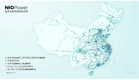 眼下,换电已成为新能源汽车主流补能模式。而蔚来官网中一则视频显示,通过蔚来换电站,即可实现全自动换电,3分钟满电出发。截至2024年5月31日,蔚来已在全国建设换电站2427座、充电桩22595根,是全国布局换电站、充电桩最多的汽车品牌。