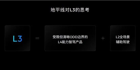 我们来看一下部分车企对于L3的定义,天气晴朗,光线良好,有雾不行,暗光不行,车道线要清晰,这个不行,那个不行。其实大家看一下,这个产品定义实际上是非常反人类的,这种ODD定义的边界对于用户来讲,模糊不清。大家知道红绿灯是非常天才级的设计,红色就是红色,绿色就是绿色。但什么叫天气晴朗?什么叫光线良好?早上上班有的时候起点雾,你觉得看不清,我觉得看得挺清。什么叫车道线清晰,这种不清晰模糊的ODD,用户突然一下子冷不丁要接管,他要怎么接管?所以这种情况所谓的L3,实际上只是自嗨而已,用户没有办法真正去使用。所以我们认为,对于L3的思考就是一个简单的公式,它就是一个清晰有限ODD边界L4的能力,加上L2全场景的辅助驾驶。