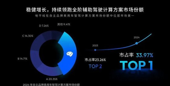 在所有辅助驾驶市场份额中,我们获得了中国市场的第一名。我们前年还是第二名,占了23.26%的市场份额,去年已经获得了33.97%的市场份额。我相信,我们今年市场份额还会继续增长。简而言之,去年整个中国市场推出来的每三台带有辅助驾驶的智能车,就有一台搭载地平线的计算方案。