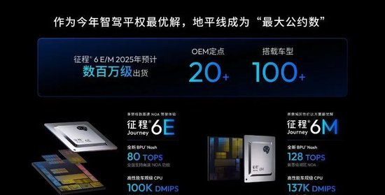 地平线去年的产品发布会所宣布的量产芯片,征程6E、征程6M这两个芯片在今年卖爆了,它成为行业的最大公约数。要知道,过去每一款产品第一年的量产上市,从来没有像这款芯片这样,第一年就会超过百万级的出货量,到现在征程6E/M已经拿到超过了20款的车型,一共搭载目前已知超过100款车型。
