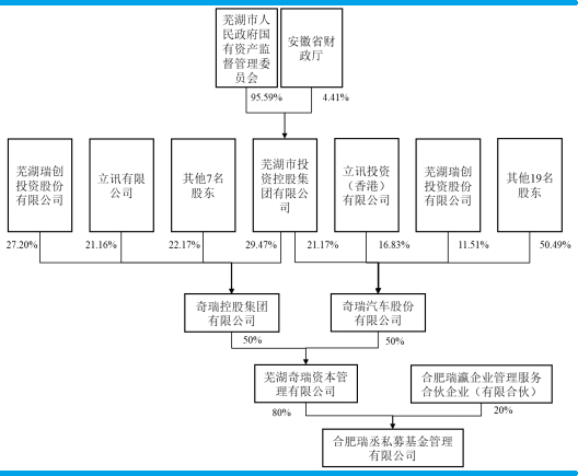 奇瑞资本是由奇瑞控股和奇瑞股份各出资10亿设立,并为合肥瑞丞多只基金直接或间接出资。奇瑞控股的股东包括芜湖投控集团(持股29.47%)、立讯有限公司(持股21.16%);奇瑞股份的股东包括芜湖投控集团(持股21.17%)、立讯投资(香港)有限公司(持股16.83%)。