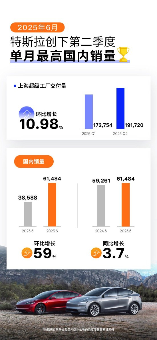 新浪科技讯 7月3日上午消息,据乘联会最新数据显示,特斯拉上海超级工厂第二季度交付量为19.1万辆,较一季度环比增长10.98%;其中6月国内销量为6.1万辆,环比上涨59%,同比上涨3.7%,创下二季度单月最高国内销量。