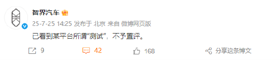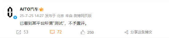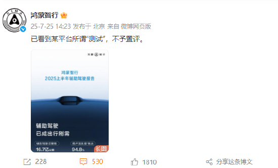 7月25日下午消息,AITO汽车、智界汽车、鸿蒙智行官方微博发文疑似回应最近懂车帝测试:已看到某平台所谓“测试”,不予置评。其还在微博上晒出了鸿蒙智行2025年上半年辅助驾驶报告。