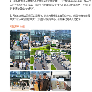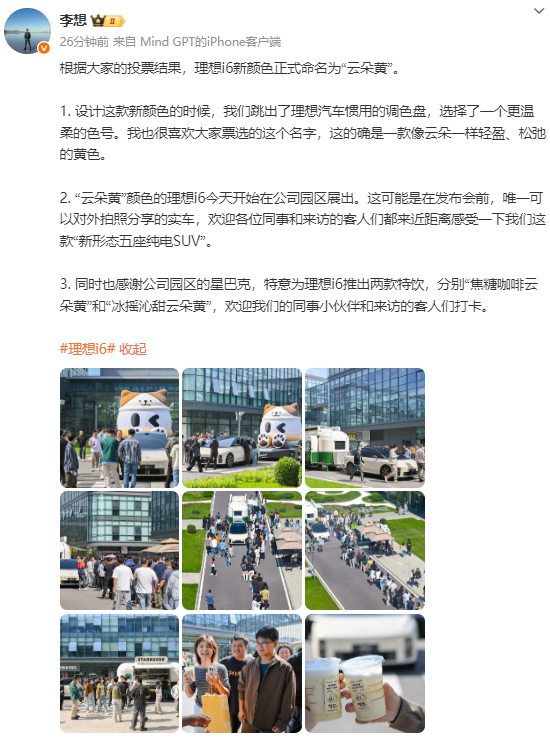 李想称,“云朵黄”颜色的理想i6今天开始在公司园区展出,这可能是在发布会前,唯一可以对外拍照分享的实车。