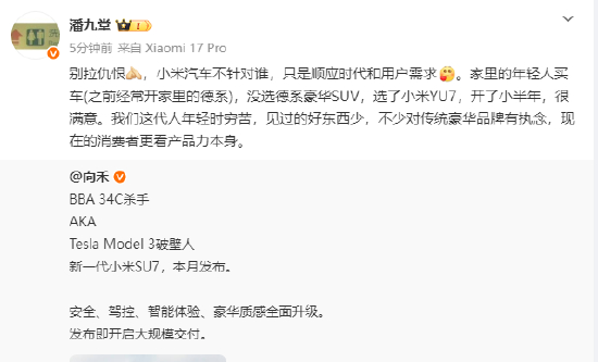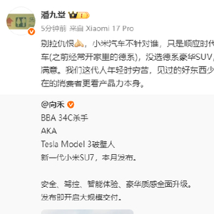 新一代小米SU7将于本月发布,有博主发文称,这是BBA 34C杀手,也是Tesla Model 3破壁人。对此,小米产业投资部合伙人潘九堂回应称,别拉仇恨,小米汽车不针对谁,只是顺应时代和用户需求。