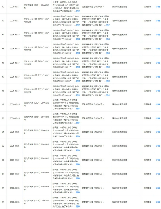 记者在天眼查发现,一天之内被多次行政处罚是曹操出行的“常态”。10月25日,曹操出行被深圳市交通运输局处罚8次,累计金额达8万元。仅隔一天时间,10月27日,曹操出行又被北京市交通委员会和深圳市交通运输局分别处罚6次、1次,累计金额达7.6万元,处罚事由涉及驾驶员未取得《网络预约出租汽车驾驶员证》,服务车辆未取得《网络预约出租汽车运输证》,均为非法营运行为。