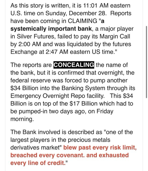 根据社交媒体X平台上广为传播的版本,“故事”是从周日“诞生”的:一家具有系统重要性的银行——即Comex白银期货市场的主要参与者,未能在美国东部时间周日凌晨2点前支付追加保证金的要求,并于美国东部时间凌晨2点47分被期货交易所强制进行清算。