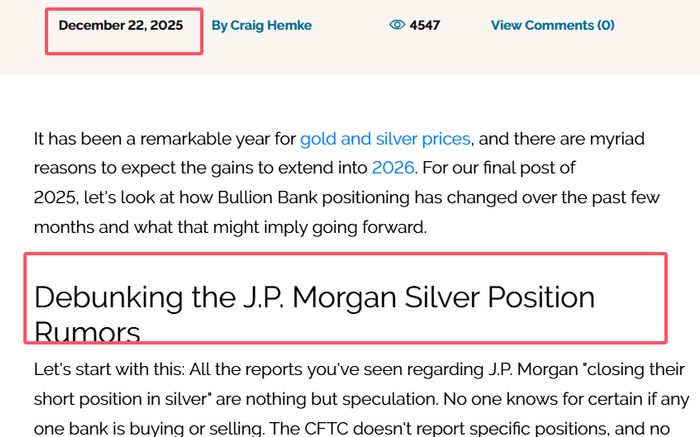 而从过去一个月的媒体报道和社交平台信息看,类似摩根大通“平仓白银空头头寸”的说法,其实早在12月初就有了——一直到上周也依然有坊间的信奉者。