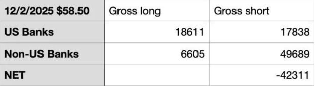 不过很有意思的是,如果人们翻阅CFTC提供的持仓报告(其会通过美国的银行和非美银行来进行划分),不难发现,截至12月初进行的月度调查报告显示,以摩根大通为代表的美国主要银行,目前其实是白银期货市场的净多头。而真正持有大量空头头寸——49689份空头合约的,是非美银行。