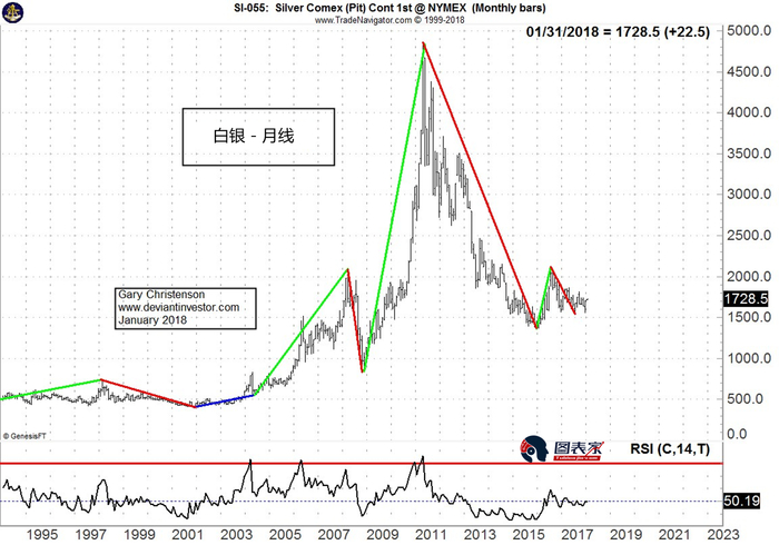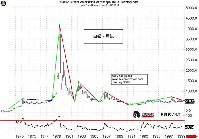 从大趋势来看(忽略短期价格波动),白银价格自1970年代初以来经历9次上涨阶段(下图绿线)、8次下跌或修正阶段(红线)、2次走平阶段(紫线)。