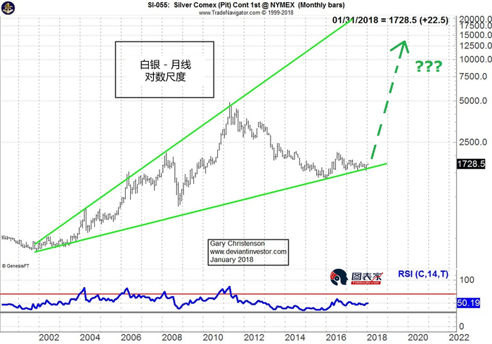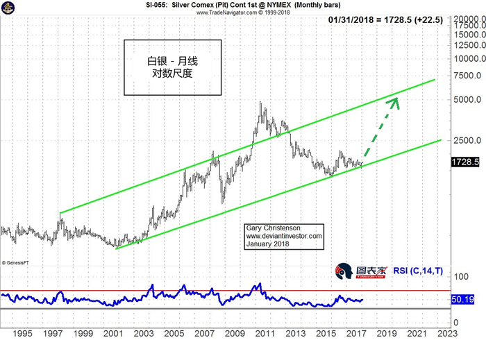 下图为25年来白银月线走势(对数尺度),价格借助上升通道走高,目前在测试通道下轨。