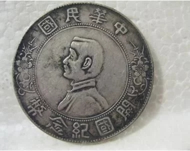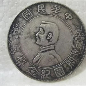 中华民国孙像开国纪念币银元,正面中央为孙中山侧面肖像,边缘内上镌中文隶书体“中华民国”4字、下镌“开国纪念币”5字、左右长枝花饰。背面中央为中文隶书体“壹圆”及嘉禾,边缘英文“中华民国”、“壹圆”,左右分列五角星(后改为六角星)。直线边齿,重26.6克,成色96%-96.9%,俗称“小头”。