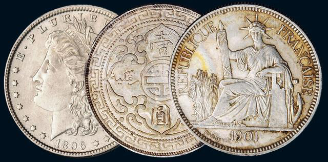 (外国壹圆银币一组三枚,1896年美国鹰洋、1900年英国站洋、1901年法国座洋各一枚)