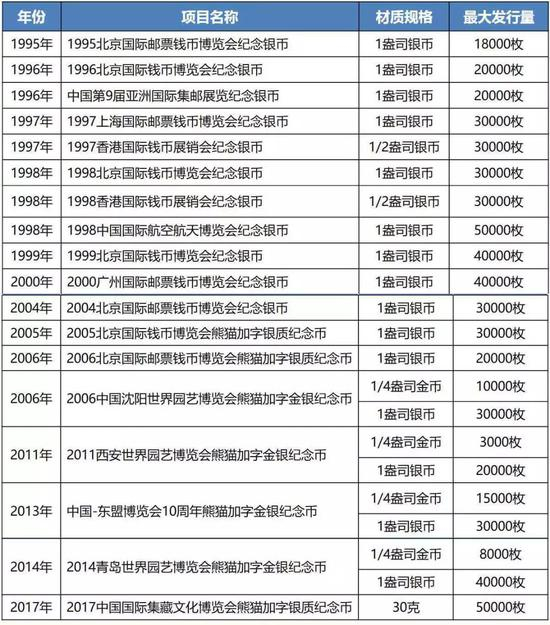 下表总结了博览会类“熊猫加字”纪念币的发行信息。